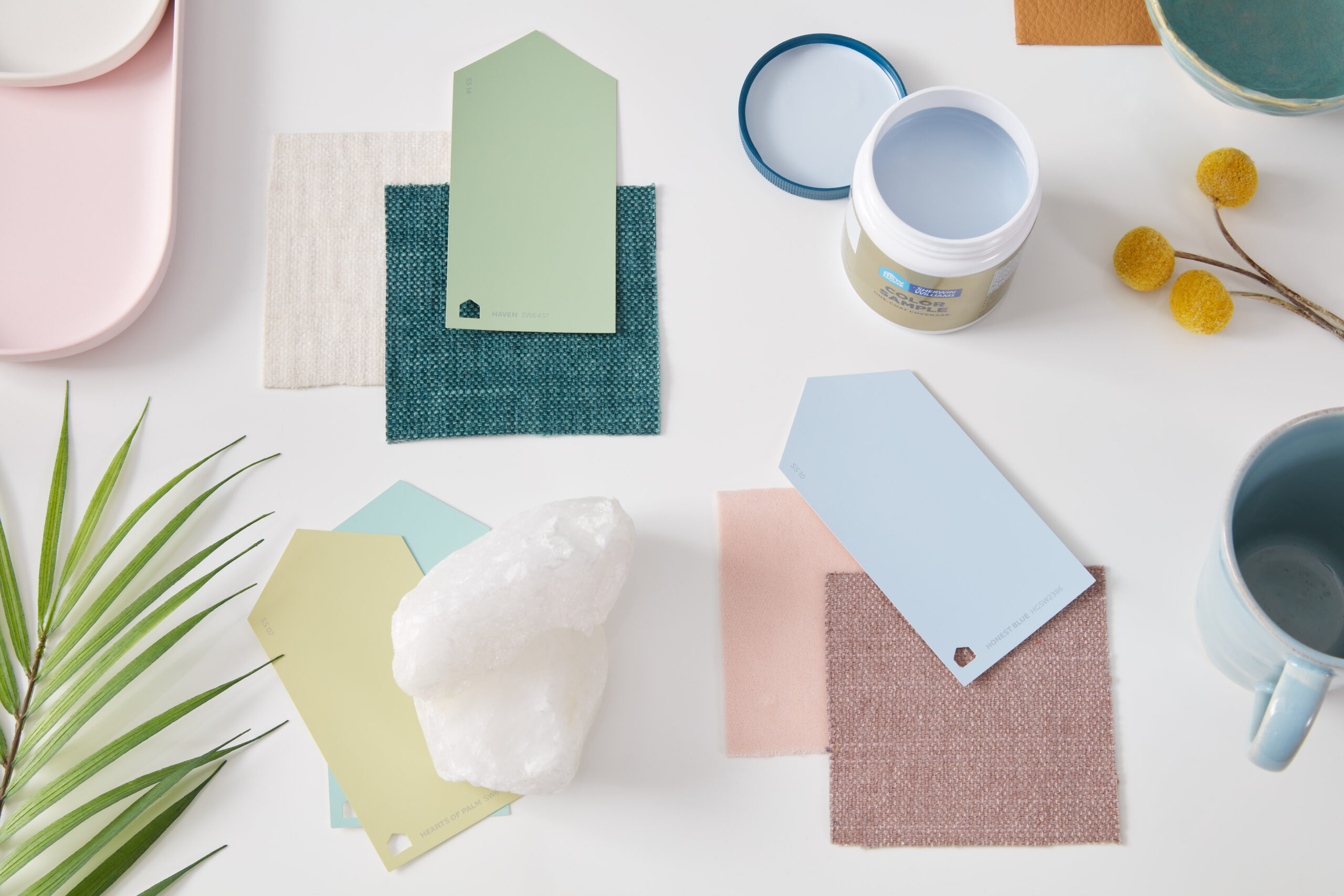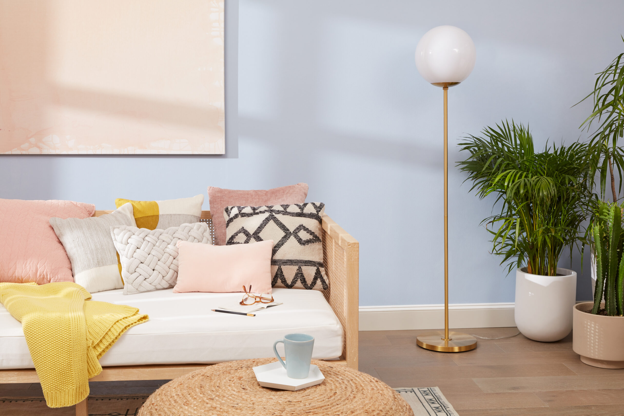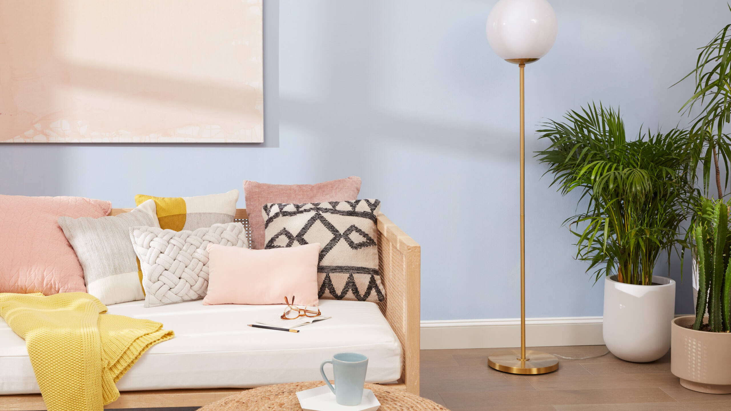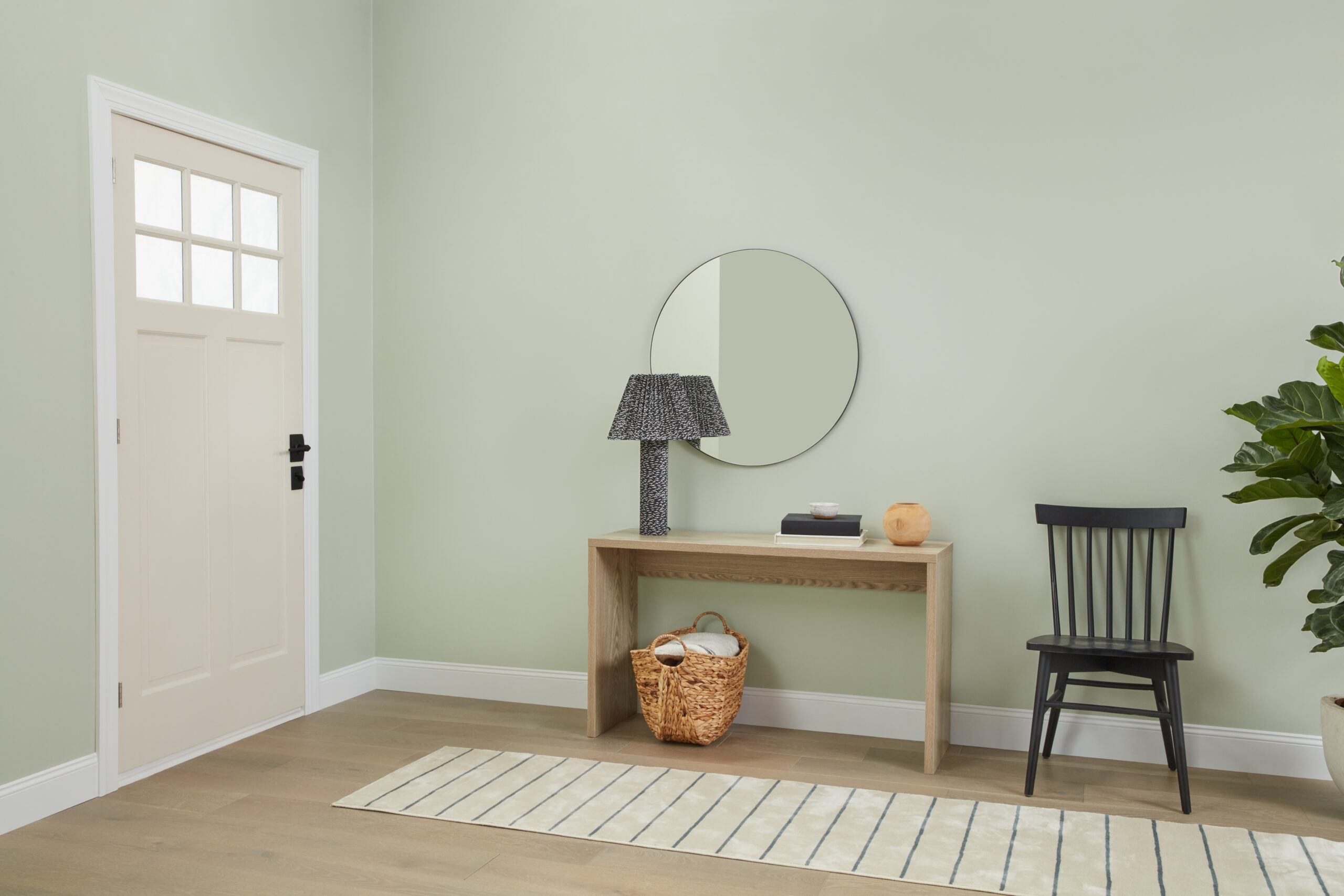 We created a living room scene that evokes a natural light feel, even though the lighting was designed using LEDs and a window frame cutout. The goal of the video was to show that paint can look different throughout the day in different types of light.