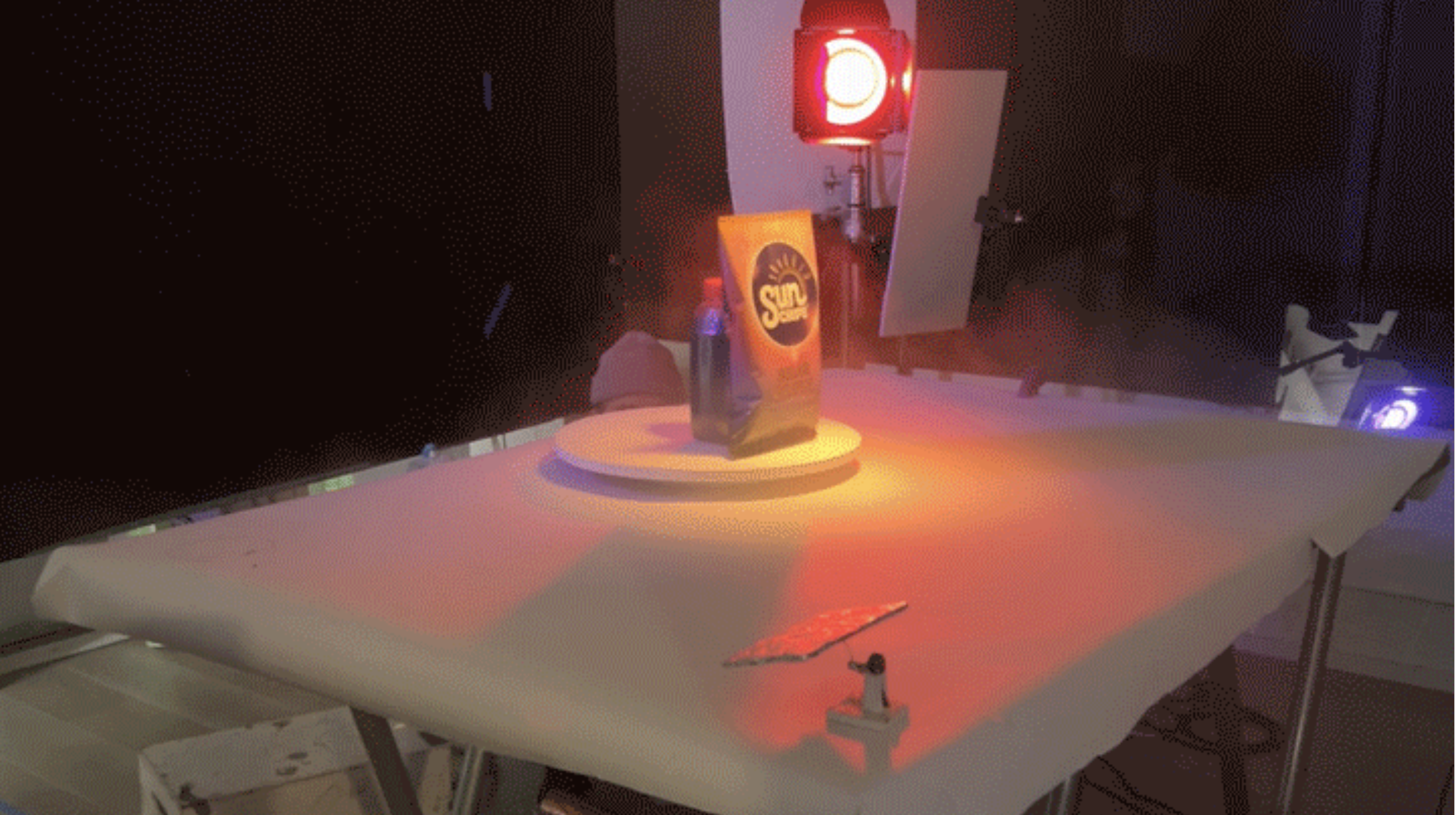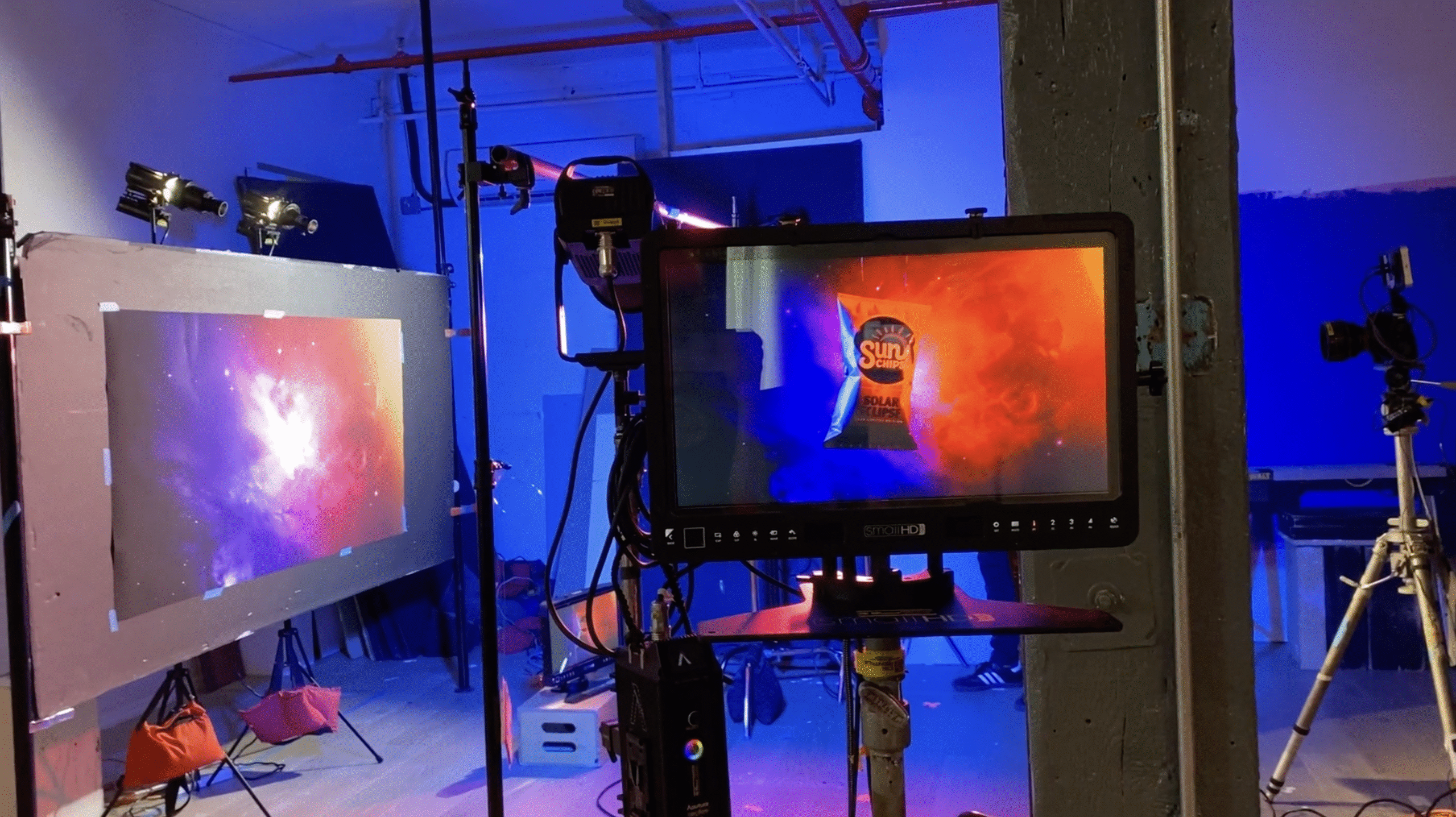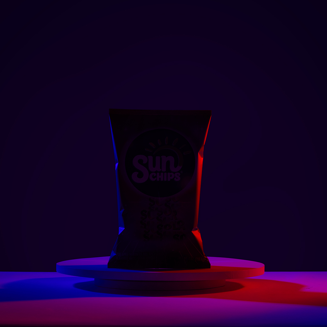 We created and printed a background in a large format that was big enough for us to have lots of space between the bag of chips and background to give it a spacey feel. The bag was hung using fishing line to give it natural movement. The fishing line was then removed in post.